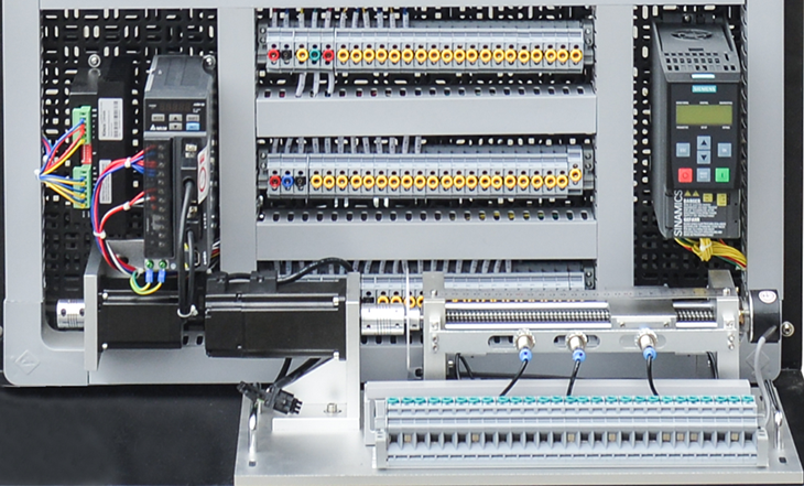 组成:伺服系统、步进系统、变频系统、小车运动模块、三相异步电动机模块;
