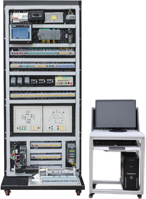 可编程控制器实训设备、可编程控制器实训工作台以网孔架为基础实训单元,仿真企业真实环境,可开展PLC系统基础模块连接实训。该工作台采用单面实训方式,实训区主要由电源单元、PLC单元、PLC学习箱单元、基础实训单元、扩展实训区(伺服控制小车运动实训单元、步进电机单元和变频器单元)六大部分组成。
