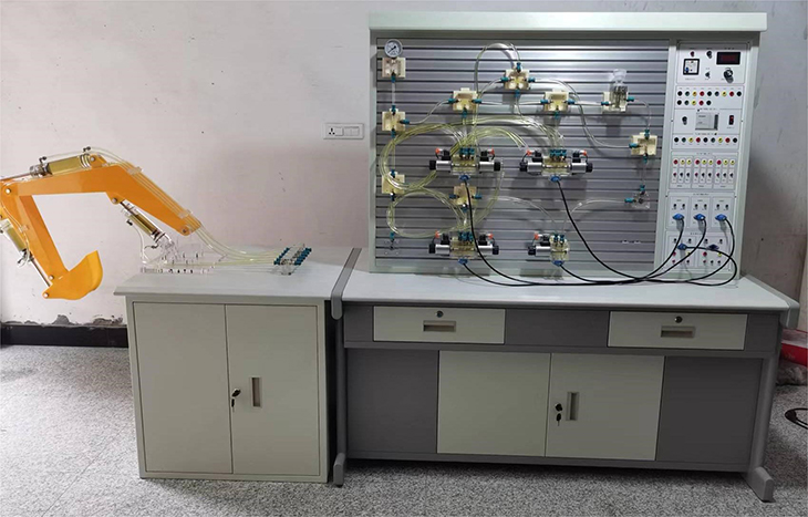 2、实训桌、实训台为铁质双层亚光密纹喷塑结构,实训桌柜内存放液压元件等。