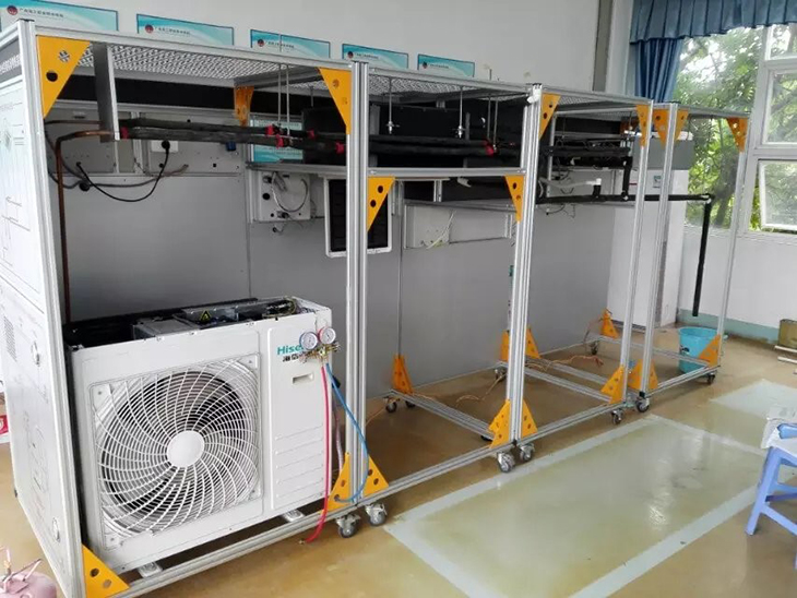 中央空调(多联机)实训装置采用开放式设计,由开放式铝合金框架、直流变频一拖三水冷机组、智能温度控制系统、工作流程图板、测量仪表、冷却水系统、配套软件等组成。展示多联机的结构形式、控制原理、系统不同工况的参数变化及空调制冷制热系统流程,并提供配套实训教材。设备及管道固定在的框架上,便于组装、调试、实训、拆解,实训装置四脚加固,安装高强度万向轮,防火、防水、耐磨、绝缘、无异味。
