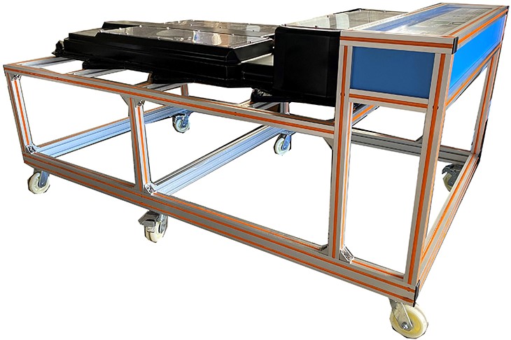 8.设备框架采用40mm×40mm和40mm×80mm两种一体化全铝合金型材搭建,耐油耐腐蚀并易于清洁,经久耐用不生锈,带万向脚轮,便于移动,并带锁止机构。