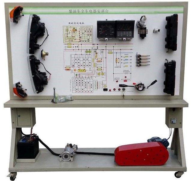 全车电路板试教板教学设备采用 全新东风牵引车EQ2102 柴油机整车电器实物为基础,充分展示汽车仪表系统、灯光系统、雨刮系统、喇叭系统、发动机电器系统、起动系统和充电系统等汽车电器各系统的组成结构和工作过程。