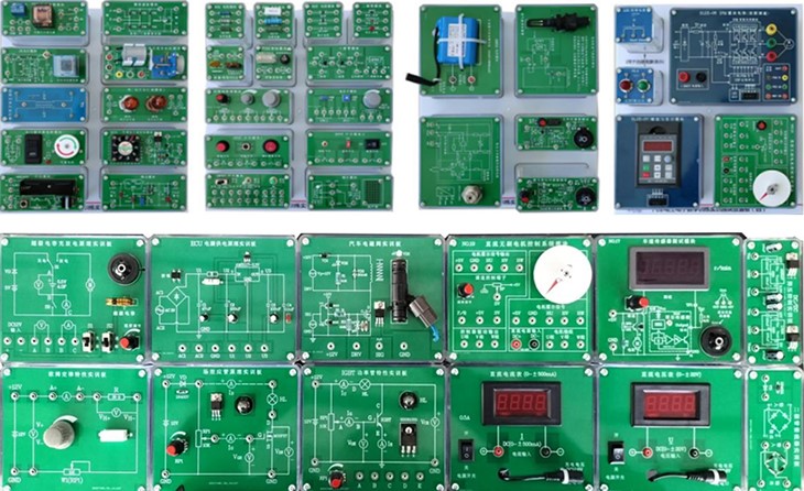 实训模块由透明封闭元件盒及PCB板构成。元件盒体由透明有机工程塑料注塑而成,具有示教功能,使用者能够观察到元件形状和接线方式,有利于教师讲解和学生认识;面板采用PCB制作而成,表面清爽、符号线路清晰、元件更换容易。