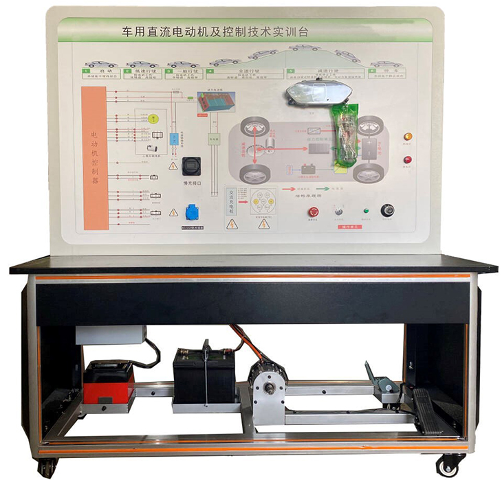 检测控制面板(装有各种检测端子,1448×940mm彩色电路图和工作原理示意图)、组合仪表、点火开关、电机控制器、车载充电器与充电接口、DC-DC转换器、锂动力电池组、电动车电机(直流无刷电机)、刹车开关、档位开关、油门控制装置、大电流继电器、电源总开关、急停开关、辅助蓄电池(12V45AH)、一体化全铝合金型材搭建的移动台架(1500×700×1700mm