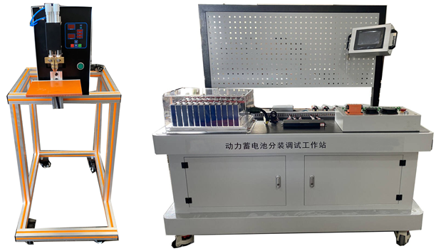 动力蓄电池分装调试工作站台面分别设计有不同的功能区域,包括电池焊接工作区、动力蓄电池分装调试工作区、动力蓄电池通电调试区。