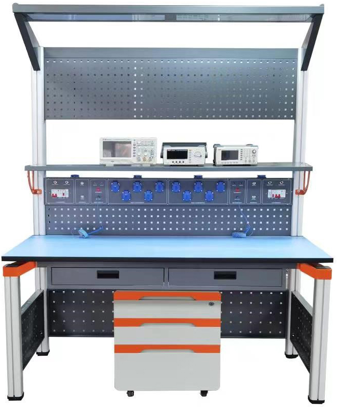 2、实训屏:安装于仪器台面下方,装配有220V交流电源输出12路:接口采用10A/250V五孔防水插座,分别位于实训屏前面板和顶面板,由过载开关分2路控制。直流稳压电源2路(0~30V、2A),由多圈电位器连续调节,输出最大电流为2A,每路电源输出有0.5级数字电流表、电压表指示。电压稳压度<10-2,负稳压度<10-2,纹波电压: <5mV。顶部电源可用作示波器、信号源、电脑主机等仪器使用。面板电源可做为电烙铁、热风焊台、电源模块工作电源等。