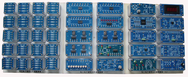 提供电工电子透明实训模块,可以完成直流电路、模拟电子技术、数字电子技术和电子综合应用实训项目。实训模块面板采用PCB板制作而成,器件和信号接口均已引至板上的专用插座,实训模块有四个弹性插脚,与专用实训孔板配套使用。