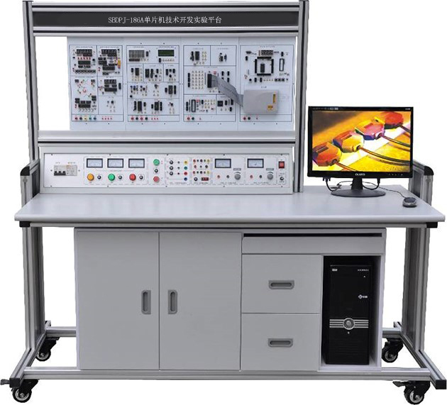 单片机技术开发实验平台,单片机技术开发实训装置,单片机开发应用技术综合实验由控制屏、实验挂箱、实验桌组成,通过本实验台可完成单片机的接口扩展、数据采集、数据显示、键盘控制、定时器、打印机接口等实验,配备有仿真器。