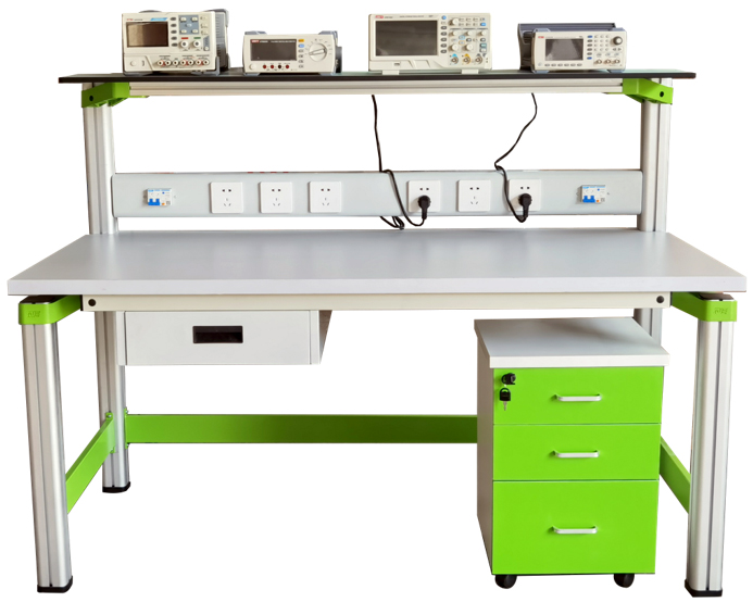 实训桌规格为1500(长)*700(宽)*1150(高),设有一个抽屉;实验桌主体结构全部采用高性能表面氧化的铝型材及一次成型铝压铸框架连接构件,连接构件采用压铸成型工艺(非焊接工艺),经机加工、抛丸、喷砂,表面静电喷涂工艺,安装方便、快捷,用户可自行DIY组装。桌体立柱采用工业铝型材成型工艺,表面氧化处理,截面尺寸:70mm×70mm,四面带槽,槽宽约8mm,端部装有注塑成型配套塑料堵头。桌面采用25mmE1级三聚氰胺饰面板,桌面板下设支撑框架,承受力不少于300kg。配备储存柜,存放元件及工具,储存柜底部4只高强度万向可制动PU脚轮,方便移动。实训装置整体简约不简单,高端大气,符合现代化产品审美和发展趋势。