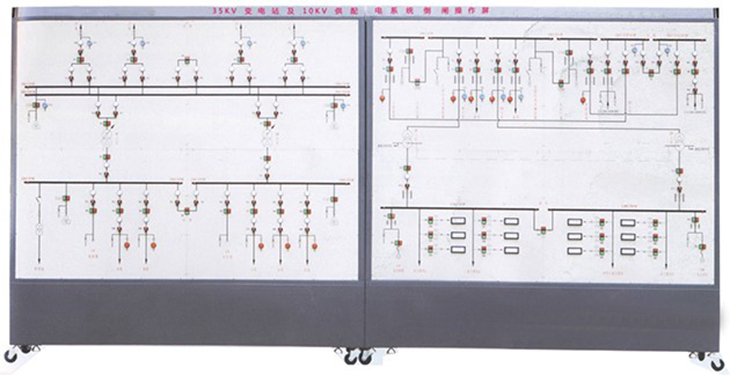 "35kV变电站及10kV供配电系统倒闸操作屏"是针对变电站倒闸操作而专门研制的实训装置。本系统含35kV、10kV和0.4kV三个电压等级:35kV具有4路进线,双母带联络;10kV侧采用单母分段,两入两出,环网供电;0.4kV侧采用单母分段,并具有备用发电系统。在此典型35kV变电站模型上,学生可以进行各种工况下的倒闸操作。变电站的电压等级和结线方式也可以根据用户要求设计。因此本装置适合各类职业院校供配电类、电力公司、职业技能培训部门等机构的培训、考核。