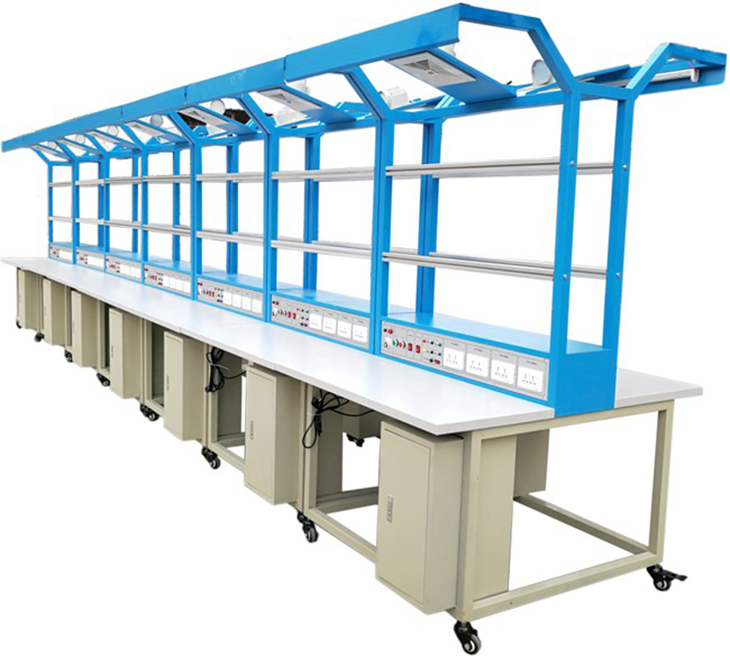 实训台上提供日光灯(用于照明)2个,透明的PVC4个,可夹放原理图等资料,另外还配备三芯双联暗插座4个、两芯暗插座2个、工具柜2个,工作台面设有绿色防静电桌垫,整个装配线安全可靠。