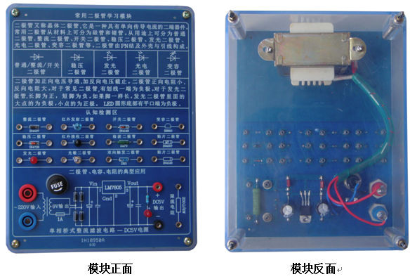 提供二极管、电容、电阻的综合应用电路:单相桥式整流滤波电路-DC5V电源的产生电路,带有熔丝保护及发光二极管指示,通入单相AC220市电即可工作(模块设有单相电源变压器),同时该DC5V电源可为其他模块检测供电之用。