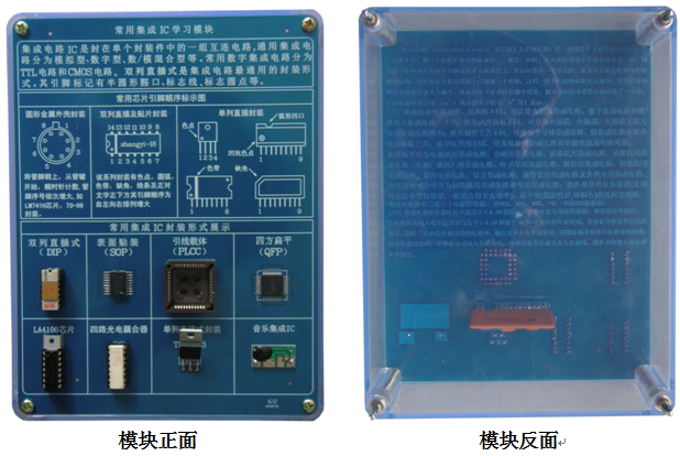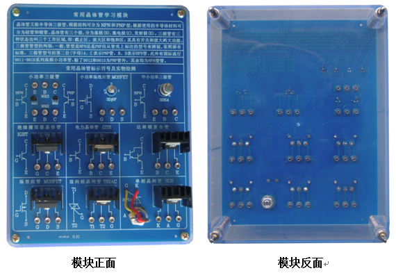 底盒使用190mm×145mm的开模有机透明塑料底盒,模块面板采用印制电路板PCB工艺,可以直观看到器件的实物及相关的原理介绍。对于典型应用及易损器件安装在面板背面,透过透明底盒能够看到器件实物,方便感性认识、检测测试,同时也能防止器件的损伤。