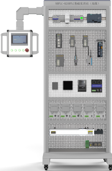 PLC基础实训站(高级)PLC基础及运动控制实训平台集成了高精度伺服和步进运动单元,用于实现精密位置控制,并配备了智能单相电表、智能语音控制模块、高速交换机等,以实现高效的电力监测、语音交互及数据通信;物料输送与检测模块包括小型电动机驱动的传送带、变频器和编码器,用于物料的自动化输送与位置检测;气动搬运模块则通过气缸实现物料的自动搬运与定位;综合控制模块以PLC为核心,配以触摸屏、按钮指示灯等组件,实现了系统的智能化控制与人机交互。