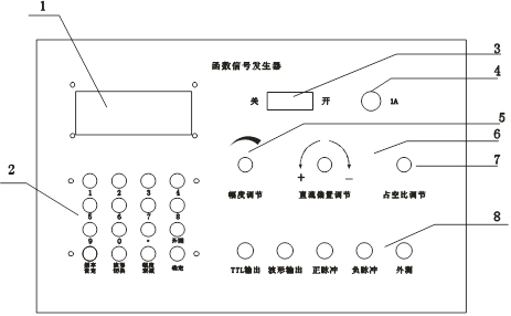 1)、液晶显示屏,用于显示设置频率、输出波形类型、衰减幅度、外测频率等。