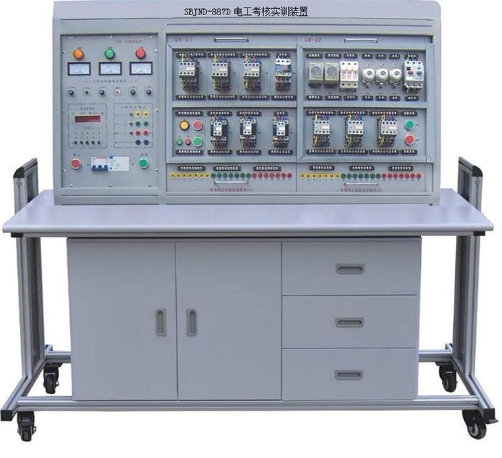 电工实训考核装置为配合我国职业教育和就业人员实际操作、培训、鉴定的需求,我公司综合了大中专院校、职业院校、技工学校的《电力控制技术》《电力拖动控制线路与技能训练》《工厂电气控制技术》《继电接触控制技术》等相关科目的实验及实训教学内容而研发了本装置。装置采用挂箱结构,实训项目可扩展性强,可扩展PLC与变频调速实训项目。所有的元器件通过导线引到接线端子上,有利于保护器件,通过线槽走线,接近工业现场。