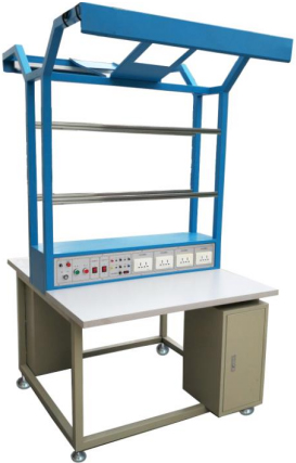 实训台上提供日光灯(用于照明)2个,透明的PVC板4个,可夹放原理图等资料,另外还配备三芯双联暗插座4个、两芯暗插座2个、工具柜2个,工作台面设有绿色防静电桌垫,整个装配线安全可靠。