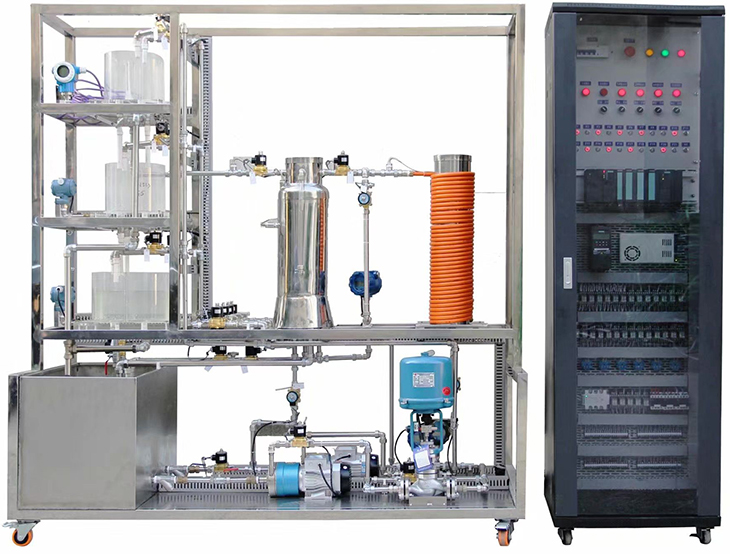 实验对象系统包含有:不锈钢储水箱;上、中、下三个串接有机玻璃圆筒型水箱;三相4.5kW电加热锅炉(由不锈钢锅炉内胆加温筒和封闭式外循环不锈钢冷却锅炉夹套构成)和铝塑盘管组成。