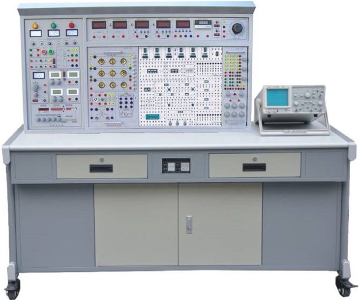 (三)实训桌:实训桌为铁质双层亚光密纹喷塑,桌面为防火、防水、耐磨高密度板,结构坚固,造型美观大方。实训桌下方设有元件储存柜,可放置实训挂箱,还设有四个带刹车的轮子,便于移动和固定。