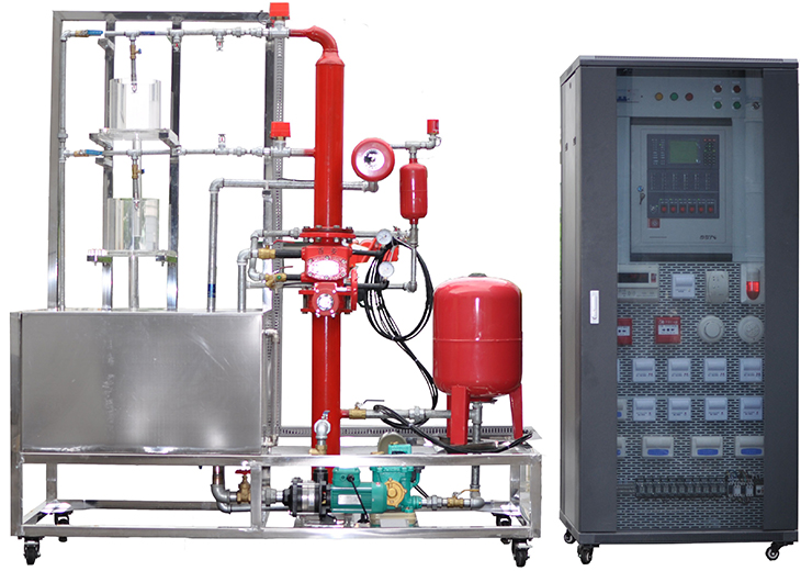模型框架和水箱等主要部件全部使用不锈钢器件,保证不生锈、不易老化,可以模拟两层大楼喷淋灭火系统;模型系统主要由喷淋水泵、气压罐、湿式报警阀、水力警铃、延时器、压力开关、水流指示器、封闭式喷头、试验阀、火灾探测器、火灾报警器等典型喷水灭火设备构成,能生动模拟大楼内水灭火系统的典型结构。
