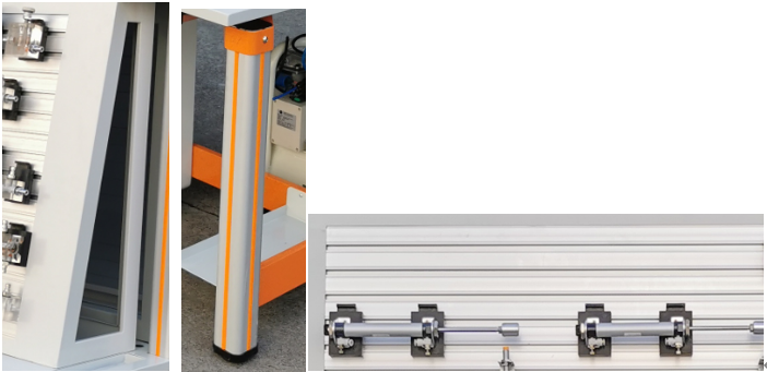 1.实验台架:实验台架规格为1600(长)*700(宽)*1760(高),实验台架主体结构全部采用高性能表面氧化的铝型材及一次成型铝压铸框架连接构件,连接构件采用压铸成型工艺(非焊接工艺),经机加工、抛丸、喷砂、表面静电喷涂工艺,安装方便、快捷,用户可自行DIY组装。桌体立柱采用工业铝型材成型工艺,表面氧化处理,截面尺寸:70×70mm,四面带槽,槽宽约8mm,端部配套模具成型塑料堵头。桌面采用25mmE1级三聚氰胺饰面板,桌面板下设支撑框架,承受力不少于200kg。配备储存柜,存放实训挂箱等,储存柜底部4只高强度万向可制动PU脚轮,方便移动。实验台架整体简约不简单,高端大气,符合现代化产品审美和发展趋势。