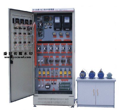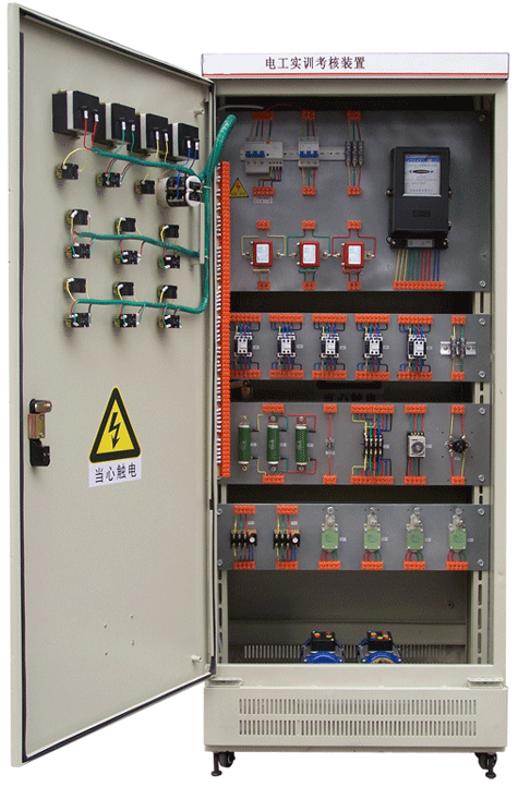 该装置按标准电气控制柜设计制造规格,充分利用双面位置,柜内装有完成各种照明电路所需的单相电度表、日光灯、单联开关、插座、感应开关、漏电开关等,以及电气控制所需要的多种低压电器,如漏电断路器、熔断器、电流互感器、交流接触器、时间继电器、热继电器、中间继电器、行程开关、按钮、信号灯、转换开关、电压表、电流表、功率表及电度表等,为了延长电器使用寿命,各电器的接点都与接线端子相连,再由接线端子与被控制电气连接。