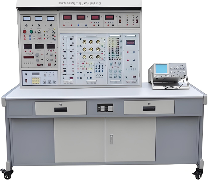 电工电子综合实训系统 在产品结构上由实训桌、实训屏、实验模块、示波器电源放置平台、实验模块存储柜等部分组成,电工电子实训装置适用于电子信息工程、通信电子电工基础、电工原理、电路与磁路、电工学等课程的教学与实训。实训装置满足实训和科研相结合,培养学生掌握电子设计理念,满足现代化创新性人才培养的需要;并可进行相关课程的课程设计,毕业设计以及电工、电子产品研制。