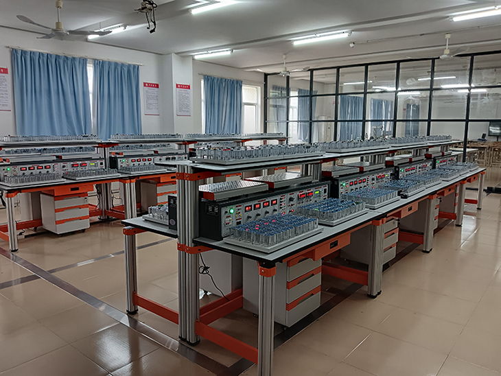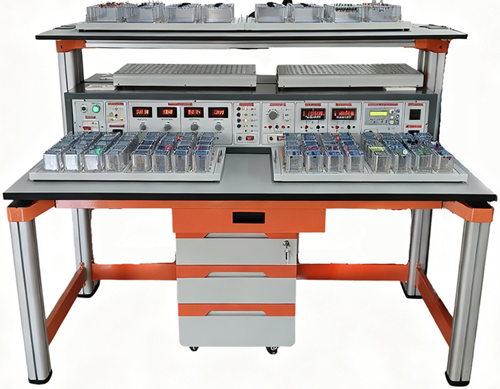 模拟电路、数字电路实验台、模拟电路、数字电路实验实训装置需适用电气类、电子类、机械类、机电类及一般工程类专业的《模拟电子技术》、《数字电子技术》、《电工基础》、《电路原理》、《电力电子技术》等多门课程的综合应用、创新实训要求。并可进行相关课程的课程设计,毕业设计以及电工、电子产品研制。电子元件采用挂箱式结构,可为学生提供综合应用、创新实训的平台。