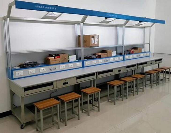 采用工业铝合金型材框架,共两层,其中第一层可放置维修工具、套件、仪器仪表;第二层可放显示器,顶部设有30W日光灯一盏和风扇一台。实训台设有一个抽屉、两个键盘托架、两个主机柜,下方设有四个刹车的万向轮。