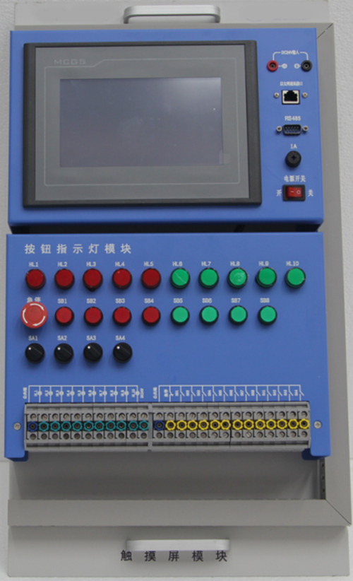 2)按钮指示灯:提供急停按钮开关1只、按钮8只,旋转按钮4只,DC24V指示灯10只。所有接口全部通过端子排引出到面板。面板印有对应的丝印接线图。可实现K3导线带插拔实训。