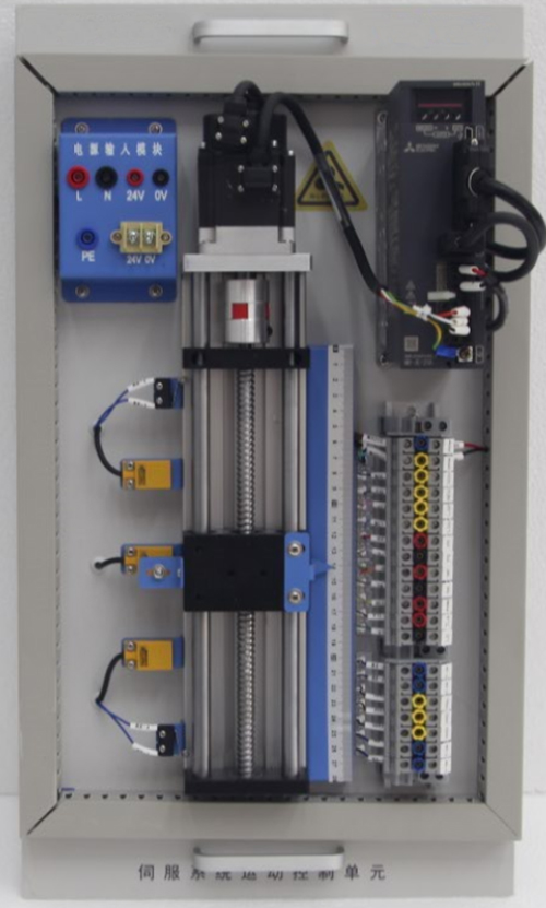 2)对象:包含滚珠丝杆、联轴器、刻度尺(0-270mm)1个、限位开关(滚动式)2个、接近开关(光电)3个、安装底板、控制接口等。可完成伺服系统参数的设置、电机正反转控制、定位控制等。