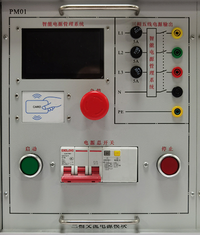 (1)提供线电压380V交流电源、相电压220V交流电源。交流电源输出设有电源保护系统,相间、线间过电流及直接短路均能自动保护。提供三相漏电保护器作为整个实验平台的电源总开关。三相输出通过停止和启动按钮控制。