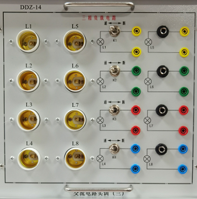 提供四组负载和四组独立的电流插座。每组负载由两个独立的白炽灯螺口灯座组成(每组设有一个开关与一个电流插座)。可插60W以下的白炽灯八只。能够完成三相交流电路实验。
