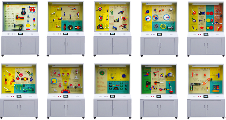 机械元件陈列柜是根据大、中专院校、技校、职业学校的机械原理教学大纲设计的电化教学设备。本陈列柜具有多功能语音播放控制系统,语音解说同步演示,采用单独驱动由电脑或电子设备控制运转演示,可由遥控控制顺序自动运行讲解,又能根据教材、教学需要而遥控任意选择还是单独演示。模型材料采用进口有机板制造,板面附有必要的图表和文字说明,演示形象逼真,运行可靠,制作工艺美观,使用本陈列柜可提高教学效果,节约学时是一套现代化机械课程教学应用实验室设备。