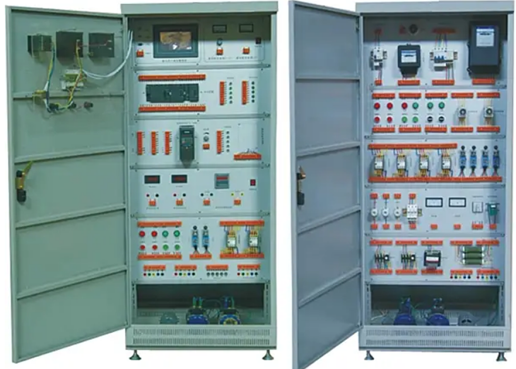 维修电工实训考核柜可完成"电工技术"、"工厂电气控制"、"机床线路控制"、"可编程控制技术"等多门课程的实训。装置资源开放,可充分培养学生的实际动手能力,适合当今教育教学中的实训训练。本装置采用用标准配电柜为主体柜、双面结构,包含如下资源:电源控制、三相交流电源,直流电源,励磁电源、电枢电源、测量仪表、可编程控制器(三菱系列)、模拟量模块、编码器、彩色触摸屏、变频器(三菱系列)、控制软件、交流接触器、按钮、指示灯、时间继电器、行程开关、中间继电器、三相异步电机、直流电机等。适用于大学、专科院校及各类职业教育培训机构的实训教学、考核鉴定。