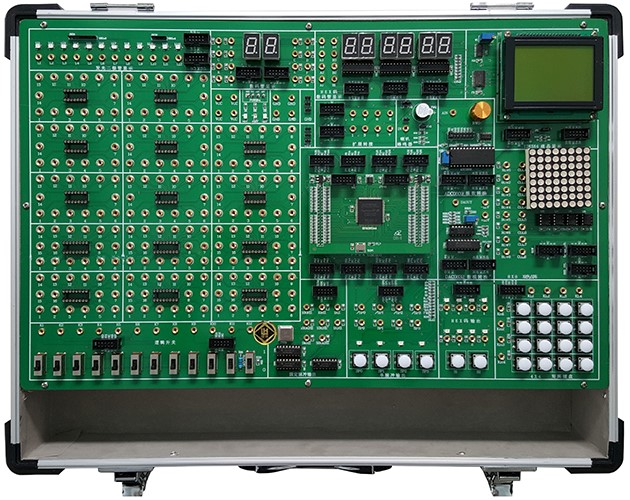 数字电路、EDA技术实验设计系统由铝木合金箱体、开关电源、常用信号源、常用模数接口、人机接口、接插式CPLD/FPGA下载板和实验电路区等组成。其中信号源由高性能单片机产生,稳定可靠。全部的实验用信号线的连接采用高可靠杜邦线和单根2号插针线,避免接触不良现象反生。扩展设计的CPLD/FPGA开发板为用户开展创新设计提供了良好的硬件平台。本实验箱适用于本专科院校所有电类和非电类专业《数字电子技术》、《数字系统设计》、《EDA技术设计》等课程的实验、实训和创新设计,有出版社出版的配套教材。