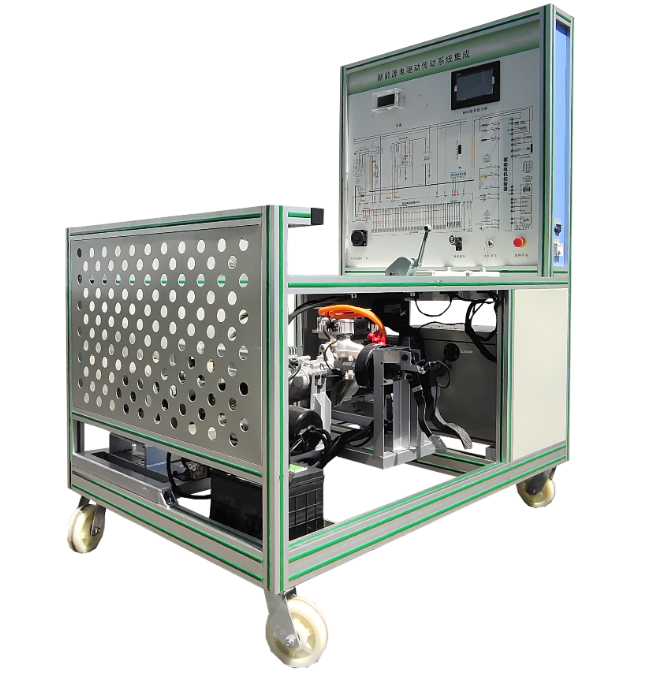 磷酸铁锂动力电池包及管理系统(带CAN通讯,含24单体电池,放电继电器,充电继电器,预充继电器,预充电阻,霍尔电流传感器,维修开关,保险,充电接口,放电接口,低压控制接口,动力电池采集模块,BMS电池管理系统主控模块,7寸液晶显示屏)、驱动电机及运行部分、电子油门总成、换挡机构总成、仪表(带CAN通讯)、变速箱、左右传动轴、左右前轮碟刹、磁粉制动器(左右)、手动张力控制器,助力器带泵总成,真空泵总成、电动真空助力刹车系统、真空压力传感器、真空罐总成、国标充电插口与充电枪、车载充电机(带CAN通讯)、DC-DC模块、故障设置系统、辅助蓄电池(12V45AH)、蓄电池断电开关、急停开关、上位机软件及数据线(电机与电池控制单元)、一体化全铝合金型材搭建的移动台架(1500×1000×1700mm