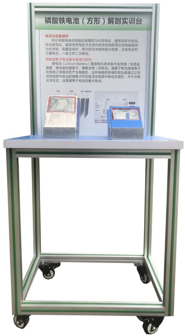 3.实训台由可移动台架与原理面板组成,面板立放,绘制三维立体解剖结构图,介绍单体电池基本知识,展示磷酸铁锂动力电池基本参数。