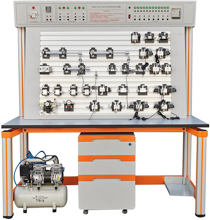 实验桌后面二支桌脚向上延伸,配上侧面三角形斜面钣金框架及带T槽铝合金操作面板组成实训操作屏,实训时固定气动控制模块等,实验台架顶部安装实验主机箱,主机箱提供实验时的时间继电器、可编程控制器、控制按钮、接近开关、直流电源等。