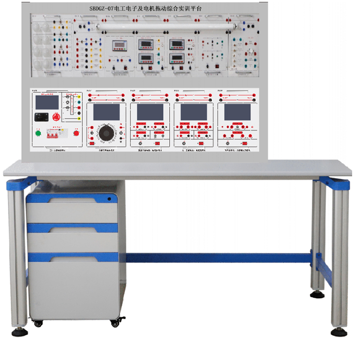 电工电子及电机拖动综合实验平台由实验桌、实验台架、存储柜、实验挂箱组件、配件等组成。具体参数如下: