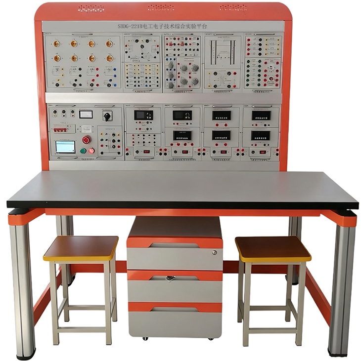电工电子技术综合实验平台由实验桌、实验台架、存储柜、实验挂箱组件、配件等组成。