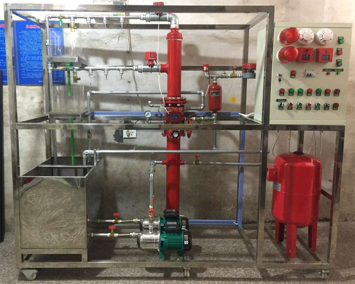 2.模型框架和水箱等主要部件全部使用不锈钢器件,保证不生锈、不易老化,模拟两层大楼喷淋灭火系统;模型系统主要由喷淋水泵、气压罐、湿式报警阀、水力警铃、延时器、压力开关、水流指示器、封闭式喷头、试验阀、火灾探测器、火灾报警器等典型喷水灭火设备构成,能生动模拟大楼内水灭火系统的典型结构。